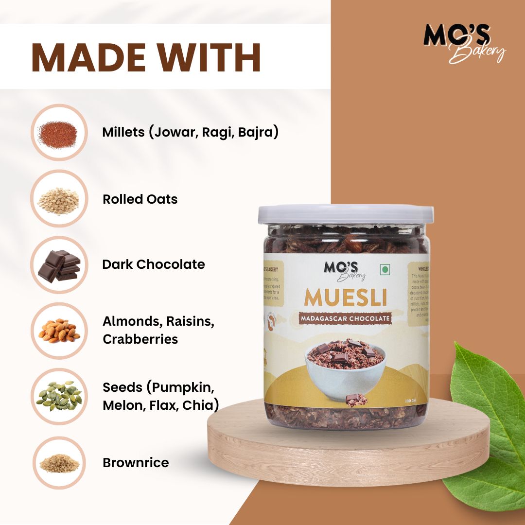 - Oats, Brown Rice, Millets (Jowar, Ragi, Bajra), Pumpkin, Melon, Flax, Chia Seeds, Kakvi, Dark Chocolate, Almond, Raisins (Green, Cranberry, Black), Vanilla Extract, Rice Bran Oil
